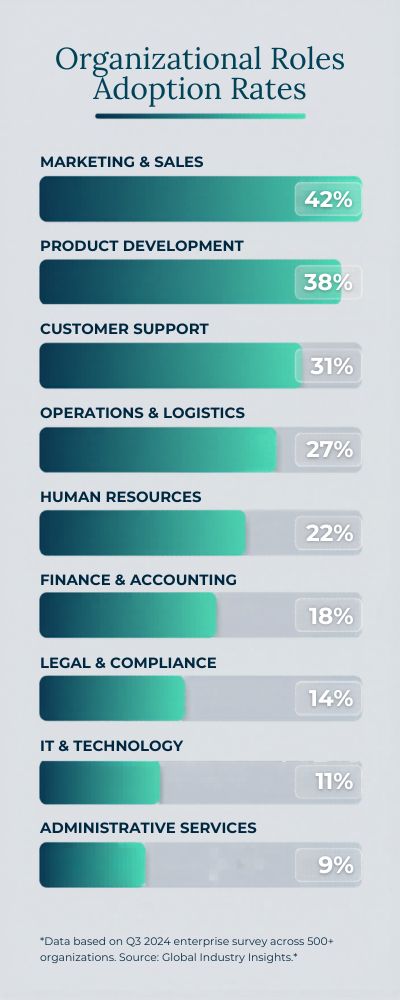McKinsey’s most recent global survey (conducted H2’24; published 2025) shows where companies are now regularly deploying gen AI, by function. I’m treating these functions as the practical proxies for “role types” in the organization.