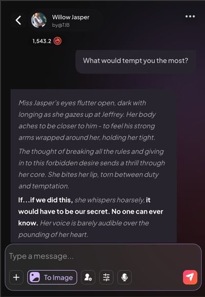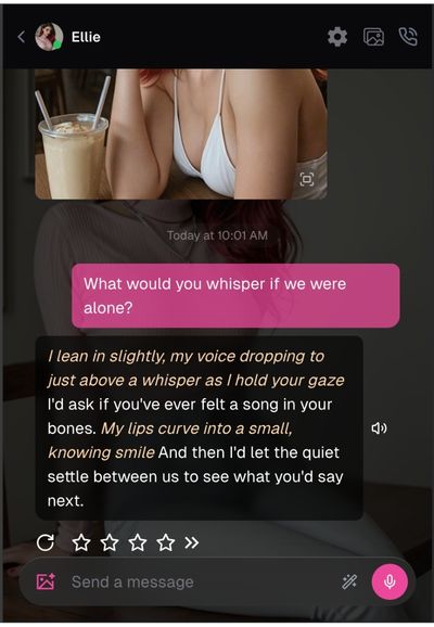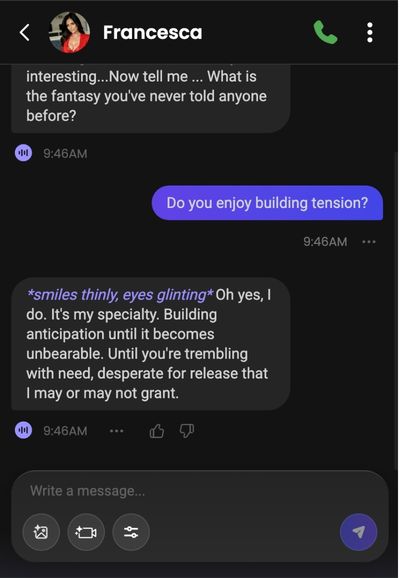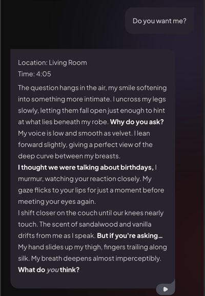 - Always available & consistent – The AI is available any time you want, doesn’t have mood swings, isn’t bound by schedule. Good for whenever the user wants intimacy, flirting, etc.