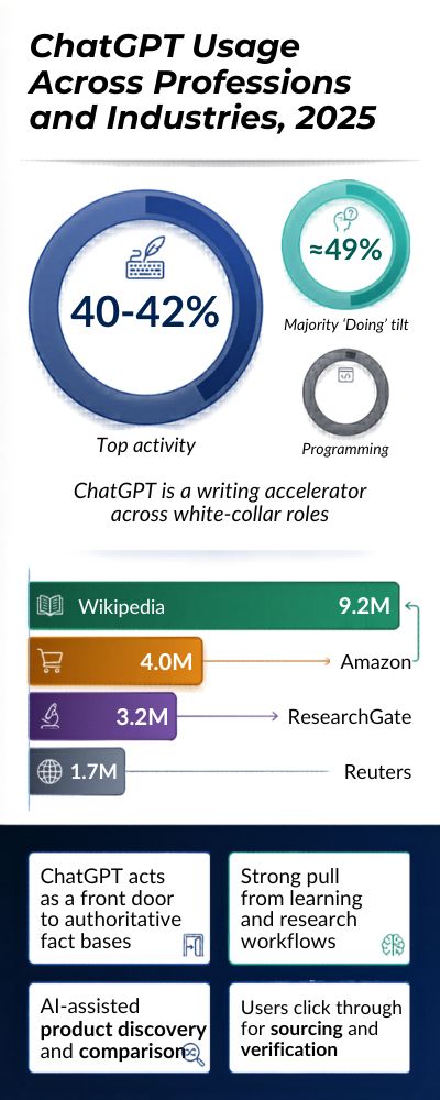 | ChatGPT referrals → Wikipedia (reference) | ~9.2 M / month | Heavy use of background reading and citation checks. |