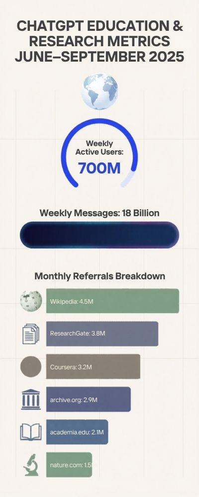 | Weekly active users (global) | ~700,000,000 | Mainstream adoption; education use sits within a very large base. |