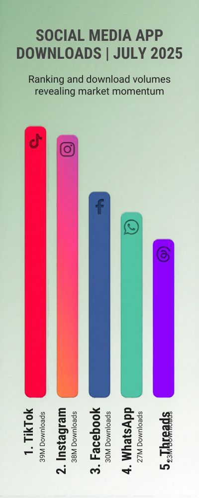 | 5 | Threads | ~23 million | Newer platform, download momentum |